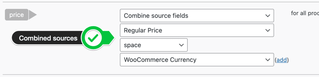 - Format: Ensure the price follows the format of a number followed by the currency, adhering to the ISO 4217 standard (e.g., “15.00 USD”). The price attribute in the feed builder is set up with a combined field (Regular price + WooCommerce Currency) so it shows correctly out of the box.