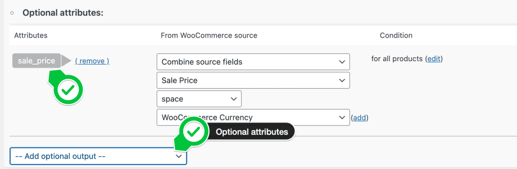 You will find the [sale_price] attribute in the Optional Attributes section. Click the “add optional output” dropdown to find the sale price attribute.