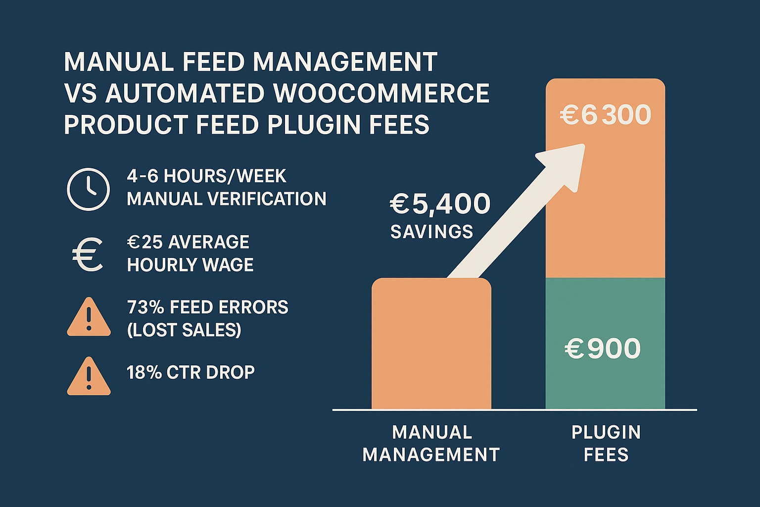 - Merchants who rely on non-specialized plugins spend 4-6 hours per week manually verifying feed compliance and troubleshooting rejections. If your marketing or operations team earns, say, €25 per hour, that’s €100-€150 per week or €5,200-€7,800 annually devoted to manual, repetitive tasks that an automated system could handle.